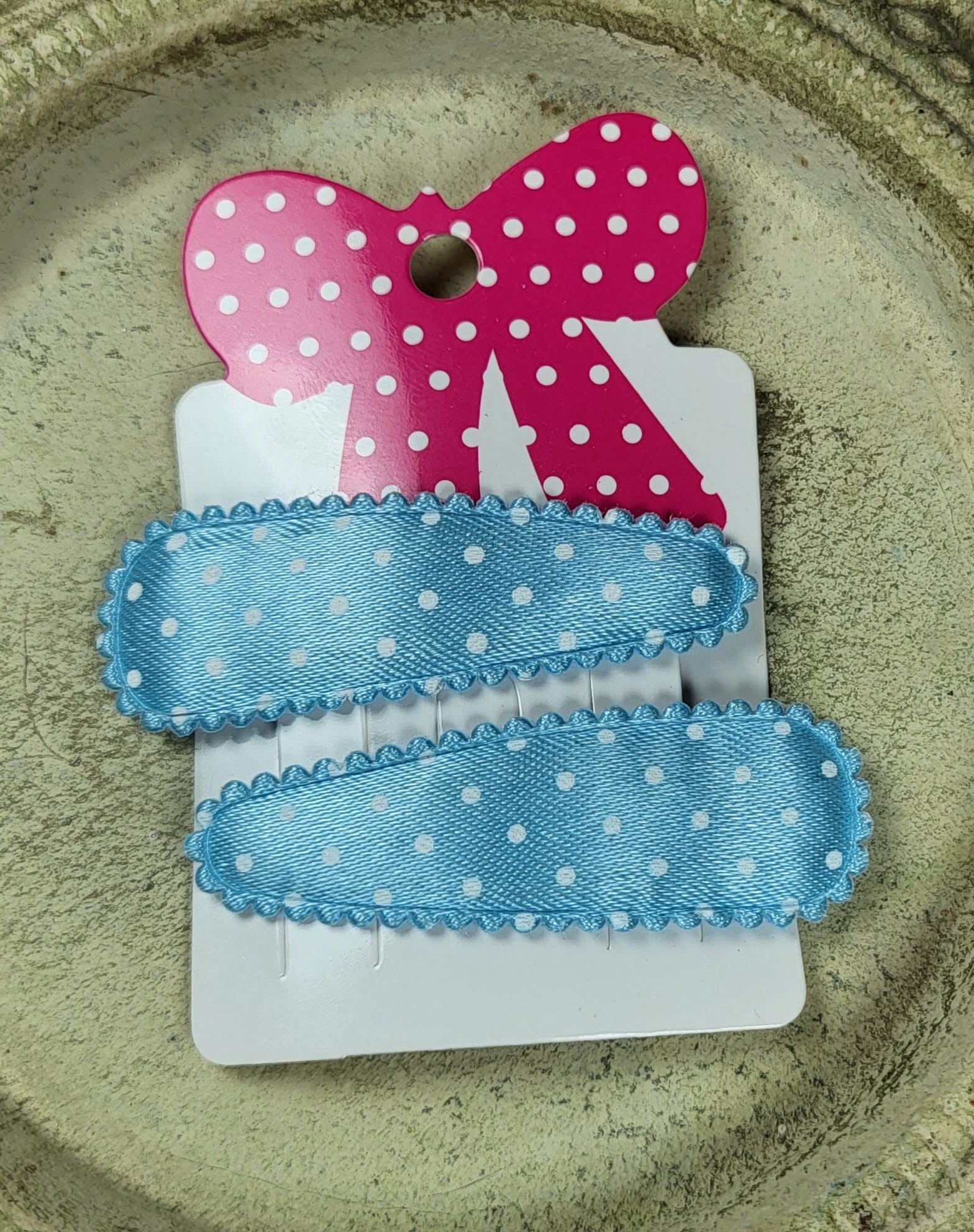 Kind klikspeld satijn lichtblauw met witte stippen