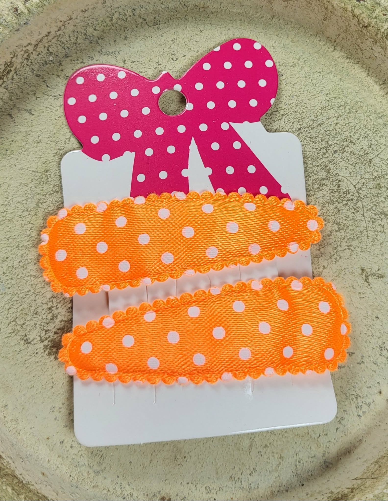 Kind klikspeld satijn oranje met witte stippen