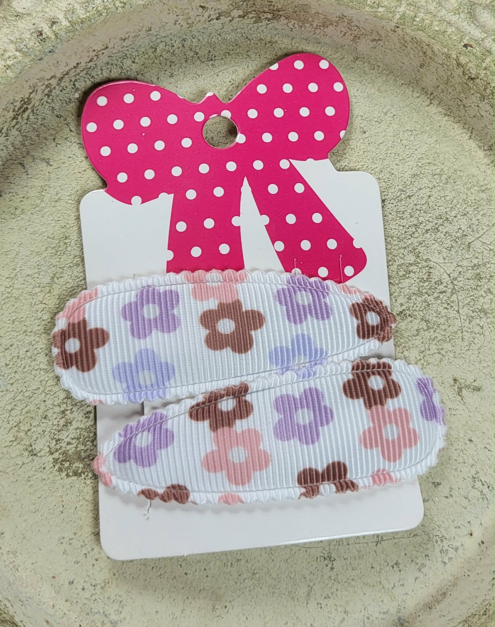 Kind klikspeld wit met bruin,paars, roze, blauwe bloemen